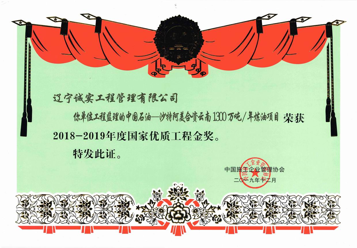 2018-2019年度國家優(yōu)質(zhì)工程金獎(中國石油-沙特阿美合資云南1300萬噸/年煉油項目)