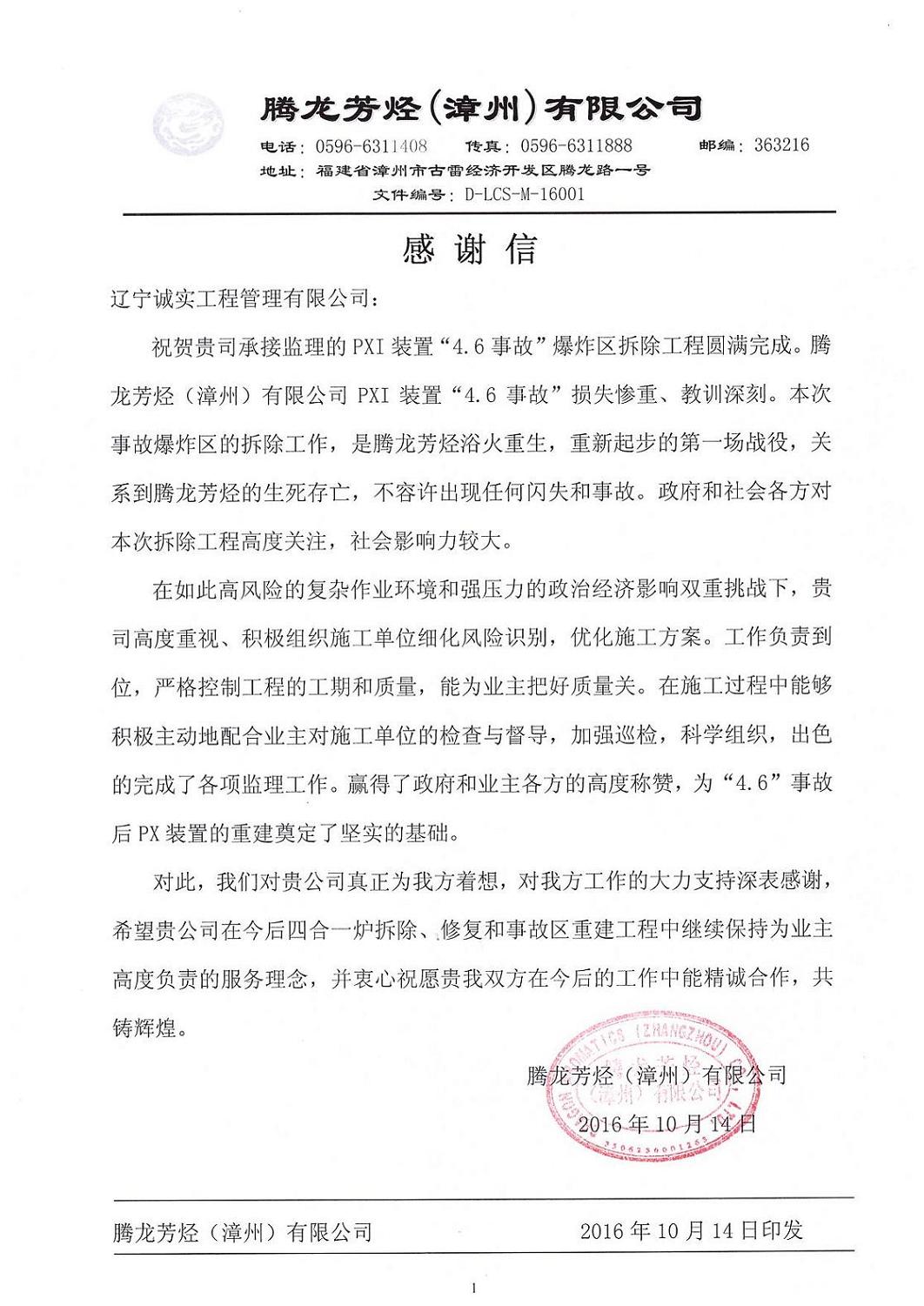 我公司監(jiān)理人員在“騰龍芳烴(漳州)有限公司PXI裝置4.6事故爆炸區(qū)拆除”工程監(jiān)理服務(wù)工作中,得到了業(yè)主單位的認(rèn)可和肯定,對(duì)我們的工作表示十分滿意,特發(fā)感謝信提出表揚(yáng)。