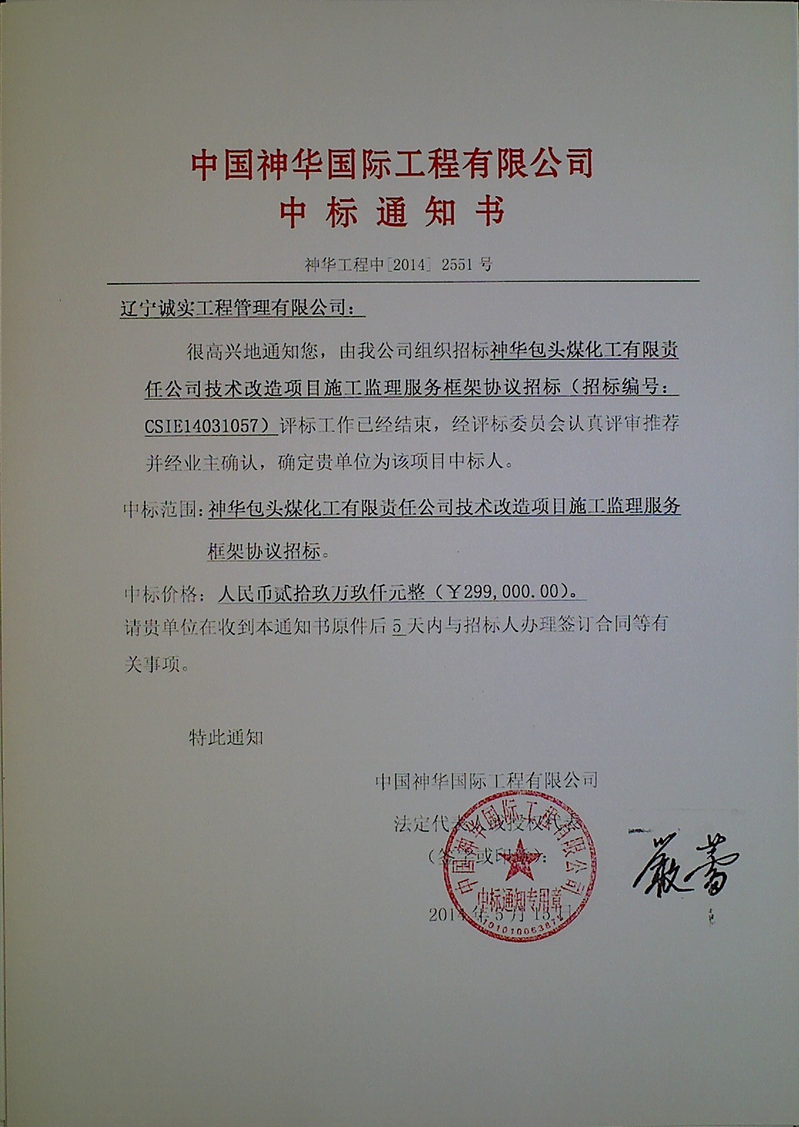 熱烈祝賀我公司成功中標(biāo)神華包頭煤化工有限責(zé)任公司技術(shù)改造項(xiàng)目施工監(jiān)理服務(wù)項(xiàng)目