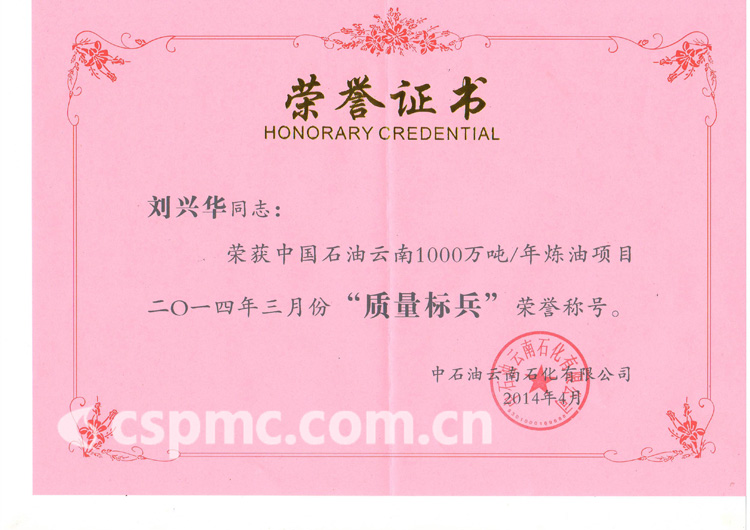 劉興華同志榮獲中國(guó)石油云南1000萬(wàn)噸/年煉油項(xiàng)目2014年3月份“質(zhì)量標(biāo)兵”榮譽(yù)稱號(hào)