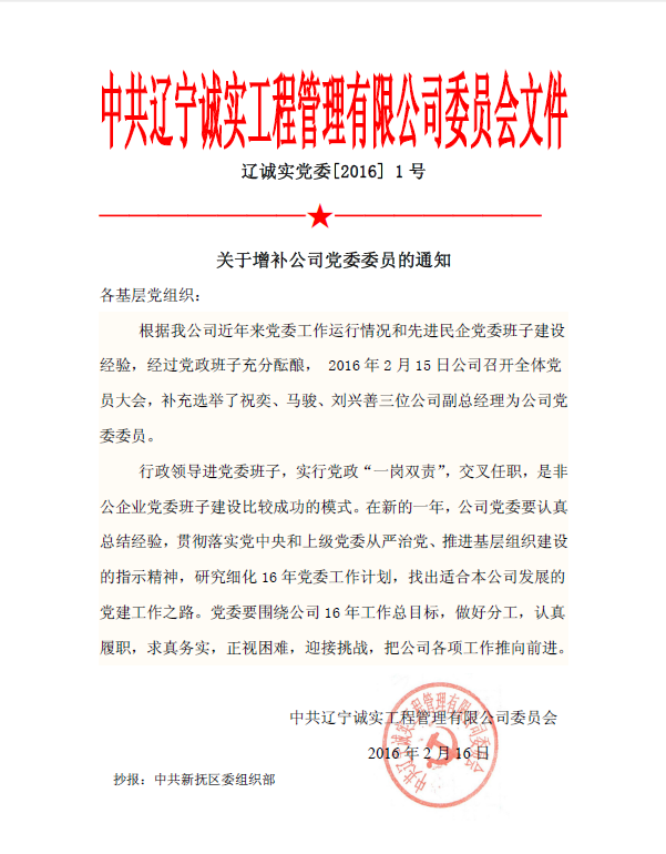 中共遼寧誠實(shí)工程管理有限公司委員會(huì)文件——關(guān)于增補(bǔ)公司黨委委員的通知