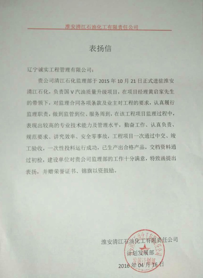 我公司監(jiān)理人員在“中石化淮安清江石油化工有限責(zé)任公司國(guó)Ⅴ汽油質(zhì)量升級(jí)項(xiàng)目”工程監(jiān)理服務(wù)工作中,得到了建設(shè)單位的一致認(rèn)可和肯定,對(duì)我們的工作表示十分滿(mǎn)意,特發(fā)函提出表?yè)P(yáng),并贈(zèng)與榮譽(yù)證書(shū)、錦旗以資鼓勵(lì)。
