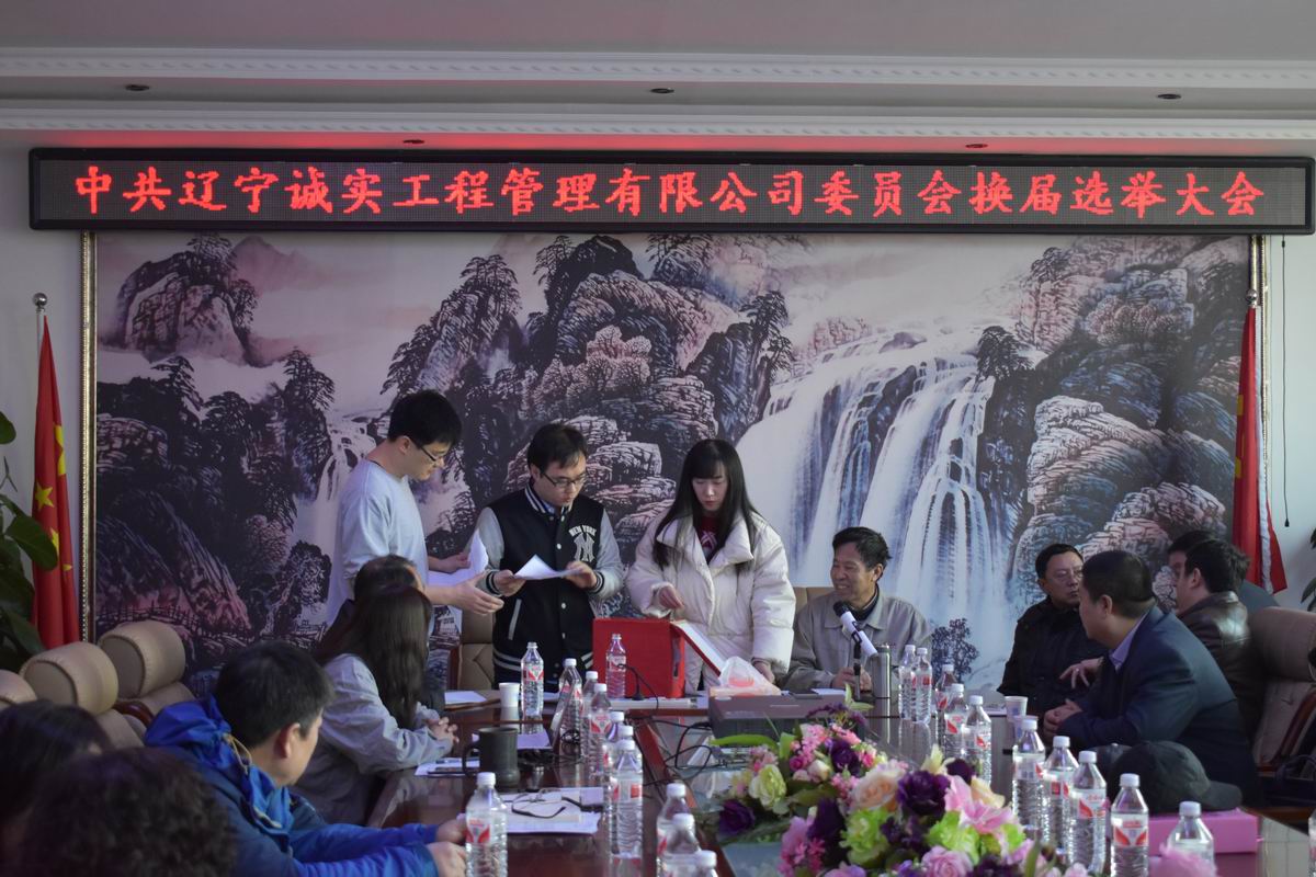 會(huì)上首先由第一屆黨委書(shū)記孫學(xué)良同志作了《第一屆黨委工作報(bào)告》,接著張冠楠同志宣讀了新組復(fù)字[2018]1號(hào)文件《關(guān)于遼寧誠(chéng)實(shí)工程管理有限公司黨委換屆的批復(fù)》,然后會(huì)議通過(guò)了監(jiān)票人、計(jì)票人名單,接著由監(jiān)票人尋藍(lán)春同志主持了選舉工作,經(jīng)差額選舉產(chǎn)生孫學(xué)良(書(shū)記)、馮玉琢(副書(shū)記)、趙劍平、任潤(rùn)東、馬駿、劉興善、張冠楠以上七名同志為新一屆中共遼寧誠(chéng)實(shí)工程管理有限公司委員會(huì)委員,最后由新一屆黨委書(shū)記孫學(xué)良同志代表新當(dāng)選委員在大會(huì)上作了表態(tài)發(fā)言。