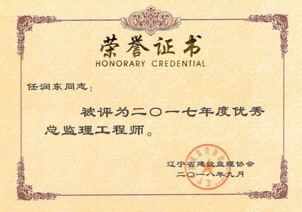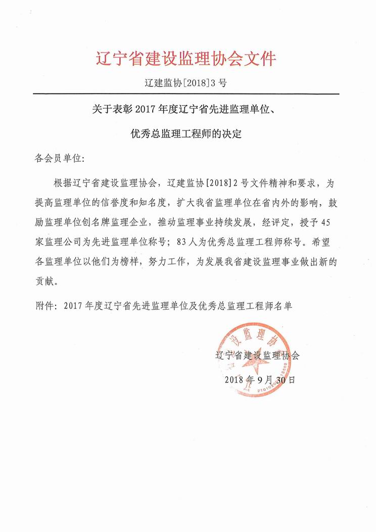 我公司被遼寧省建設(shè)監(jiān)理協(xié)會(huì)評為2017年度遼寧省先進(jìn)監(jiān)理單位、任潤東和馬駿被評為優(yōu)秀總監(jiān)理工程師