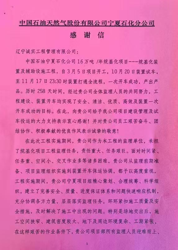 信中,中國石油天然氣股份有限公司寧夏石化分公司對(duì)我公司及項(xiàng)目監(jiān)理人員的工作十分滿意,給予了很高的評(píng)價(jià)與肯定,并表示衷心的感謝。