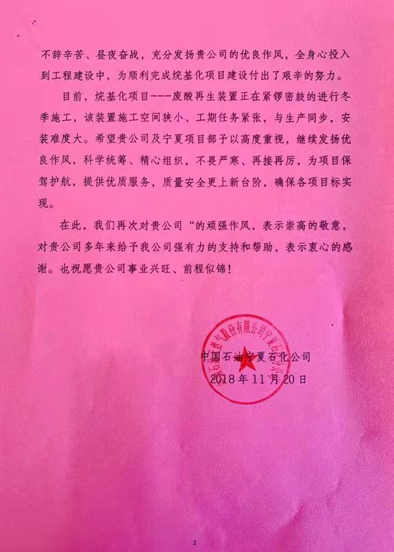 2018年11月20日,我公司收到了一封來自業(yè)主——中國石油天然氣股份有限公司寧夏石化分公司的感謝信。